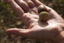 La encina, el alcornoque, el quejigo y el roble. Las primeras son las más queridas por los cerdos, porque su fruto es el más dulce de todos. La dehesa tiene un manto de hierbas frescas que protegen al fruto del barro y evitan su deterioro. El tamaño de la bellota es muy respetable, así que no me extraña que los cerdos se pirrien por ellas.